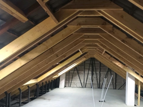 2. La seconde étape consiste à repositionner l’isolation déjà présente dans votre comble afin d’assurer des conditions de travail confortables. Une fois cette tâche accomplie, la transformation de la charpente peut réellement commencer avec la mise en place des poutres horizontales. Ces sections de bois ont pour mission de supporter une partie des charges du toit. Elles apportent une stabilité qui permet son renforcement. Par la suite, nous ajoutons des pièces de liaison ou des poutres supérieures afin d’assurer une rigidité sur l’ensemble de la structure et empêcher toute déformation dans le futur.