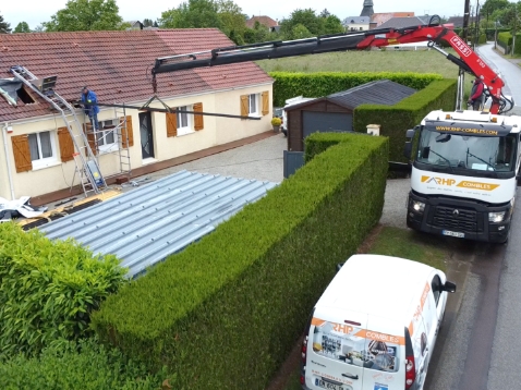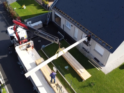 1. Lors de l’arrivée des équipes à votre domicile, le chantier démarre par la réalisation d’une ouverture dans la toiture. Ce trou dans le toit a une double utilité. Il permet d’acheminer les matériaux à l’aide d’un monte-charge et il fournit un accès direct au chantier pour les équipes. Ceci garantit votre intimité durant les travaux. Nous effectuons toutes les étapes, de la transformation de la charpente à l’installation des lucarnes, par cette ouverture. Pas de panique, ce trou d’homme est soigneusement refermé chaque soir.