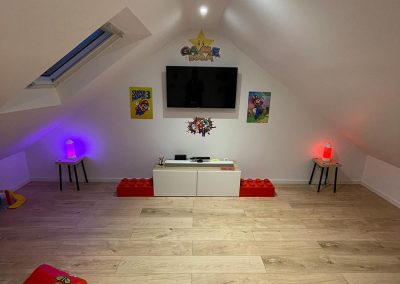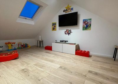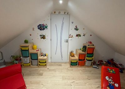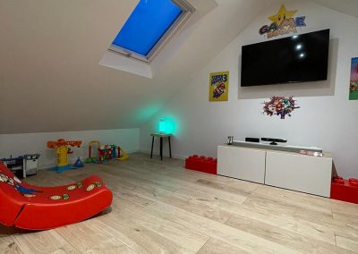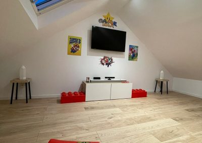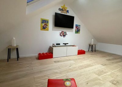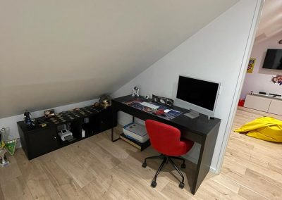 Les propriétaires souhaitaient aménager un espace salle de jeux pour leurs enfants et un espace de télétravail pour eux. Nous avons conçu des zones spécifiques pour répondre à leurs besoins : une salle de jeux spacieuse et un bureau confortable et fonctionnel pour le télétravail.