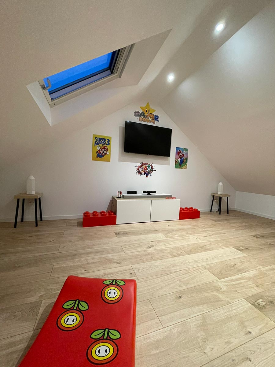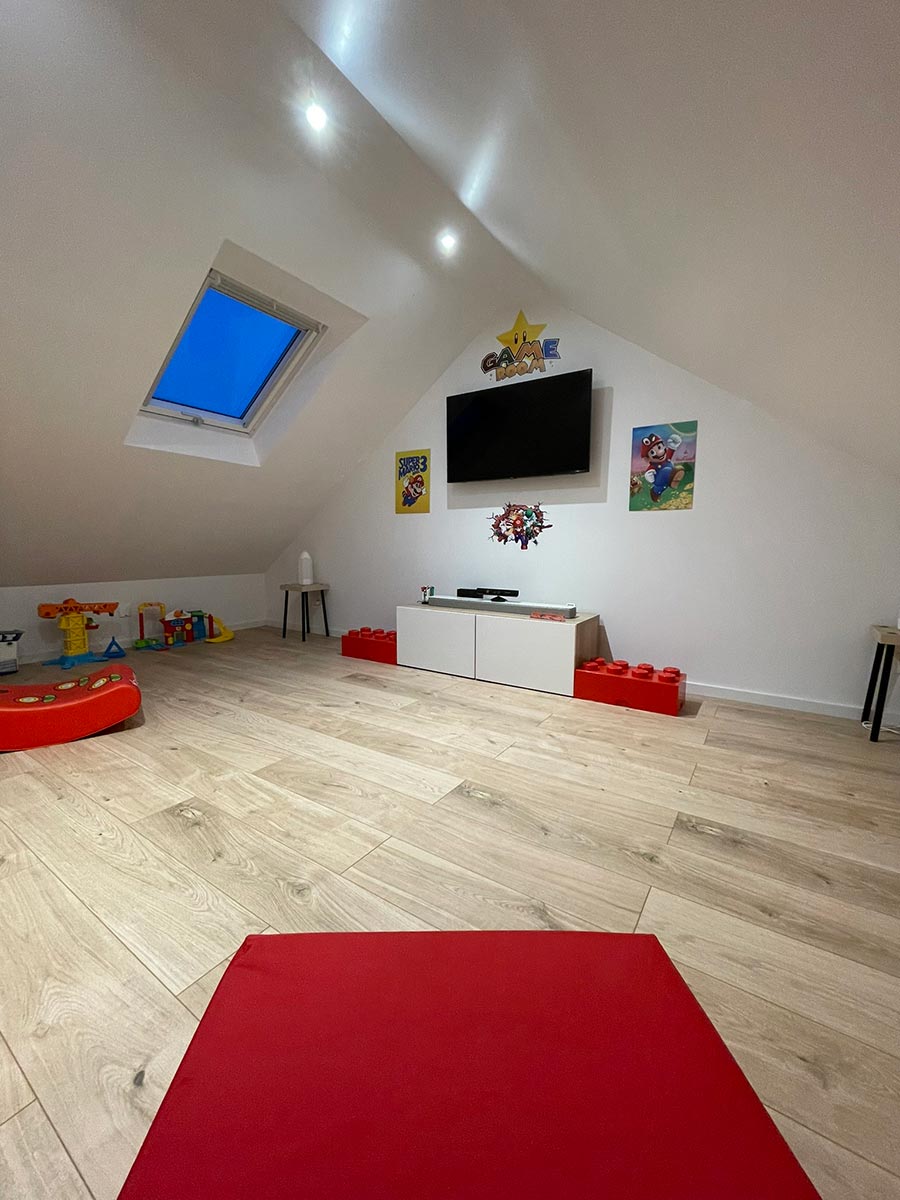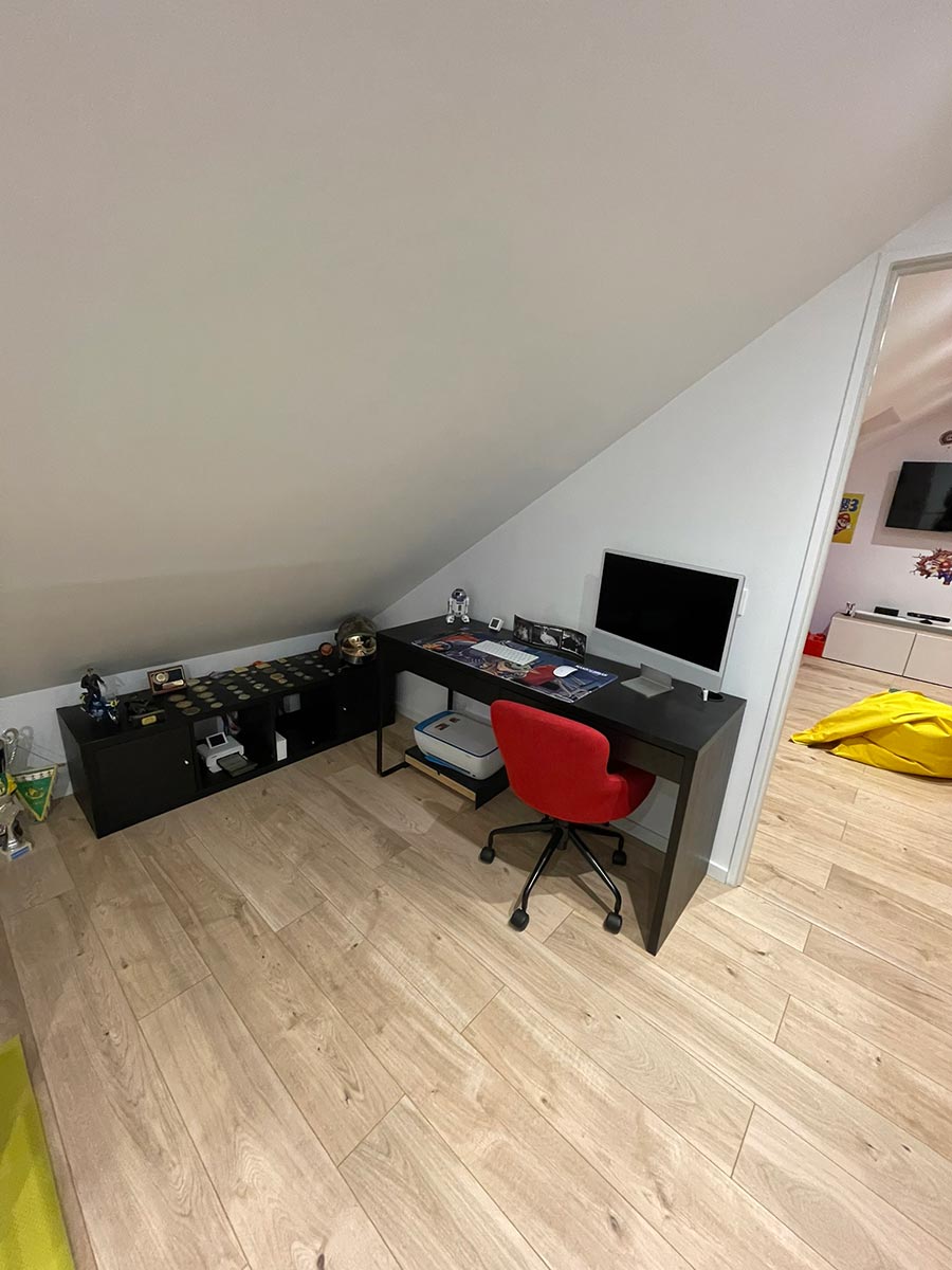 Les propriétaires souhaitaient aménager un espace salle de jeux pour leurs enfants et un espace de télétravail pour eux. Nous avons conçu des zones spécifiques pour répondre à leurs besoins : une salle de jeux spacieuse et un bureau confortable et fonctionnel pour le télétravail.