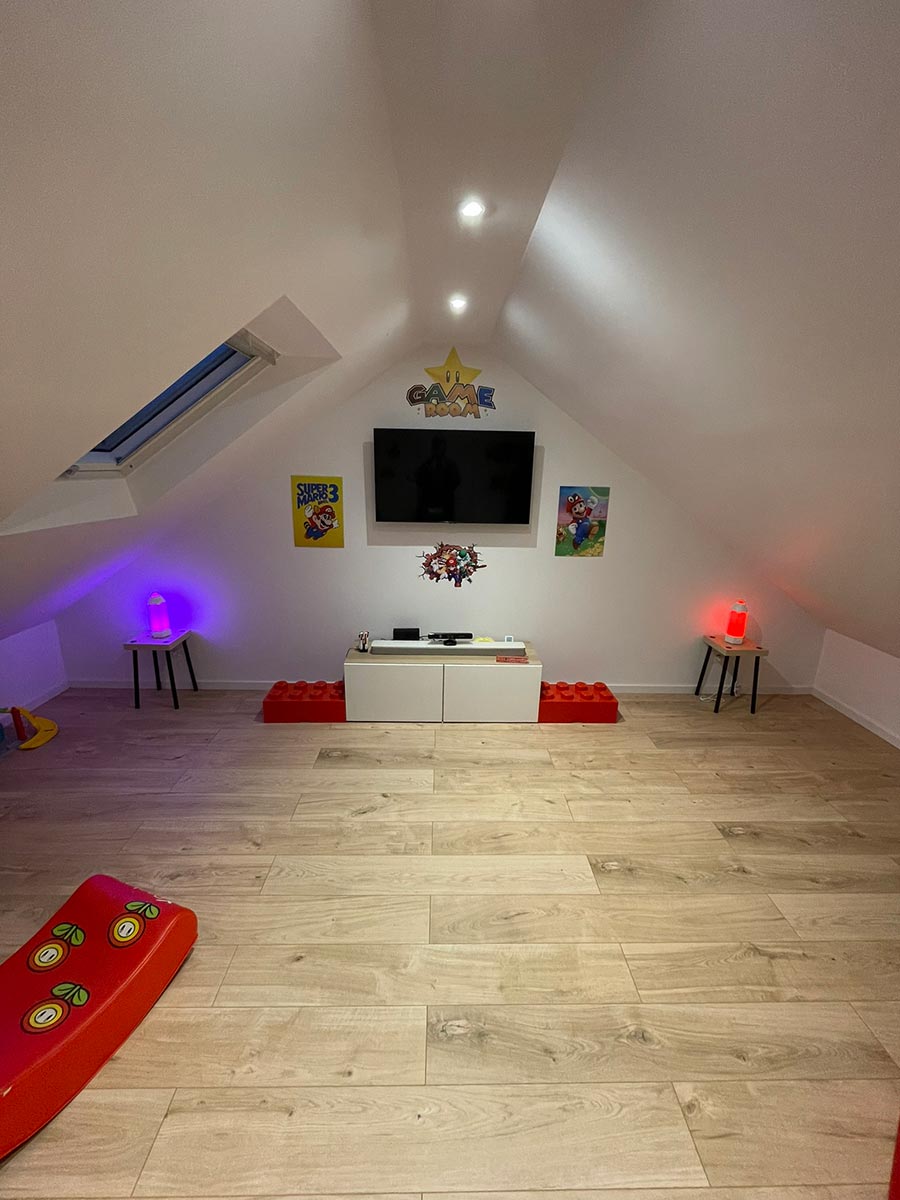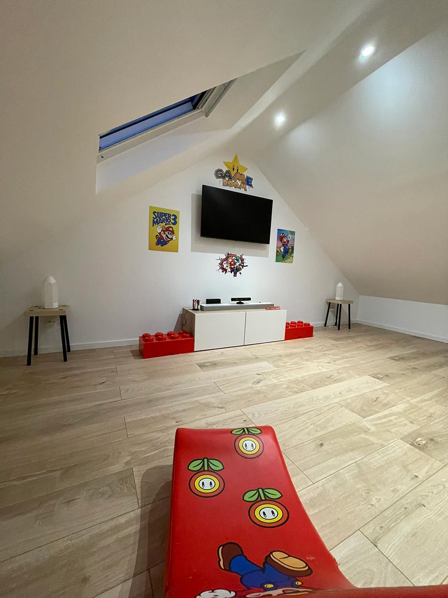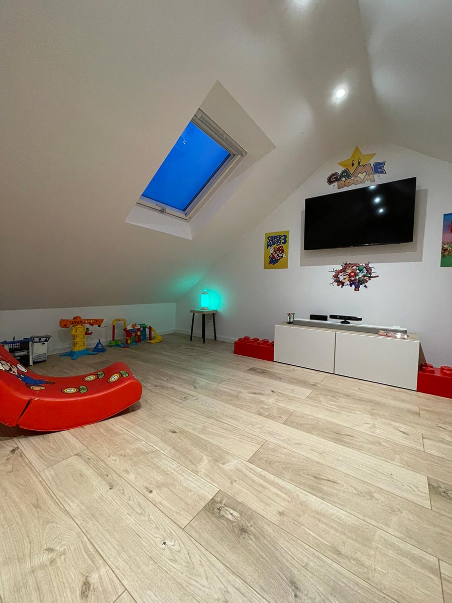 Les propriétaires souhaitaient aménager un espace salle de jeux pour leurs enfants et un espace de télétravail pour eux. Nous avons conçu des zones spécifiques pour répondre à leurs besoins : une salle de jeux spacieuse et un bureau confortable et fonctionnel pour le télétravail.