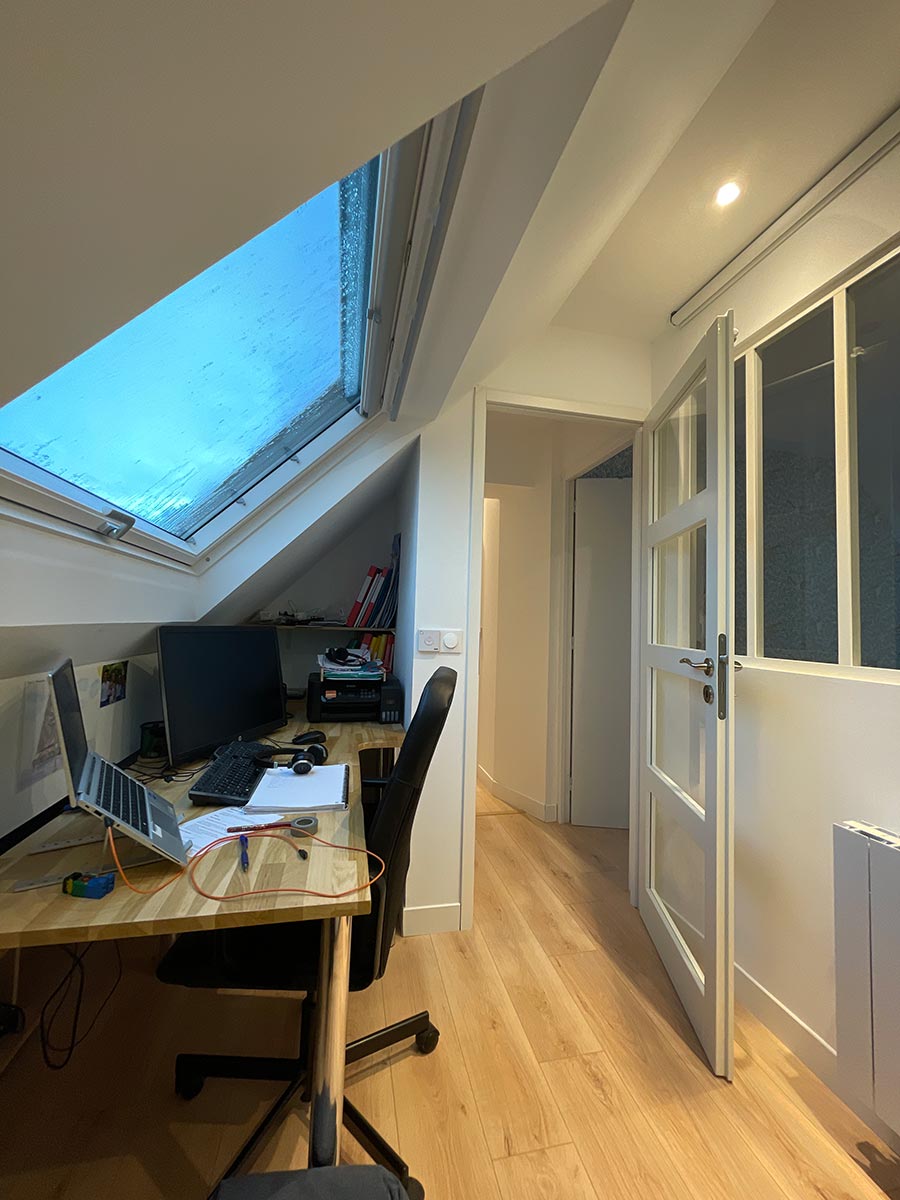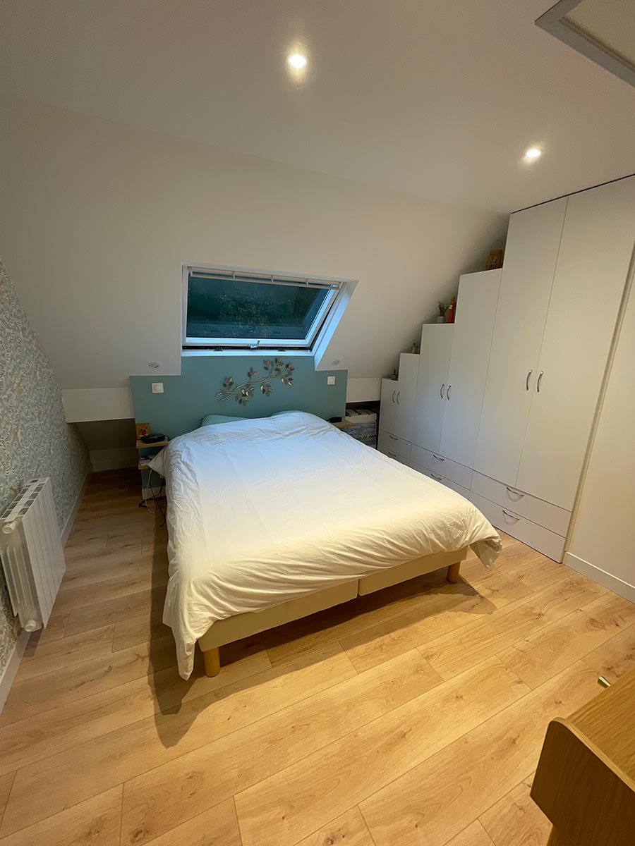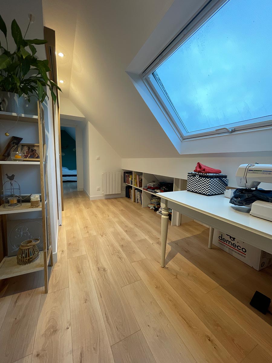 Pour améliorer l’éclairage naturel du comble, nous avons installé un Velux de 114×118, inondant les nouvelles pièces de lumière naturelle et créant ainsi une atmosphère chaleureuse et accueillante.
