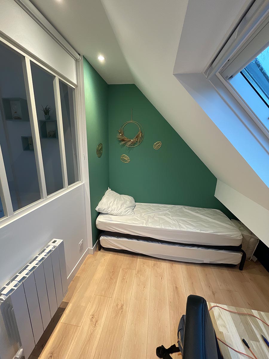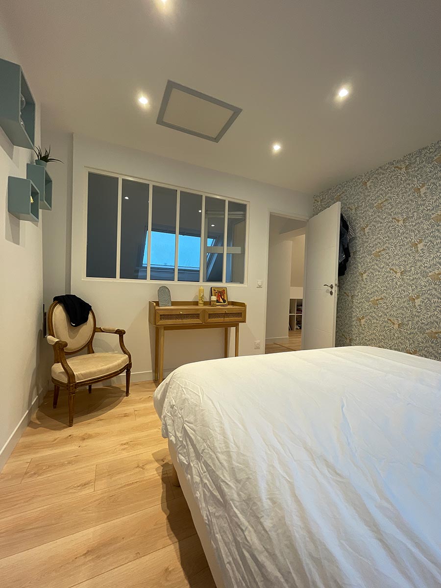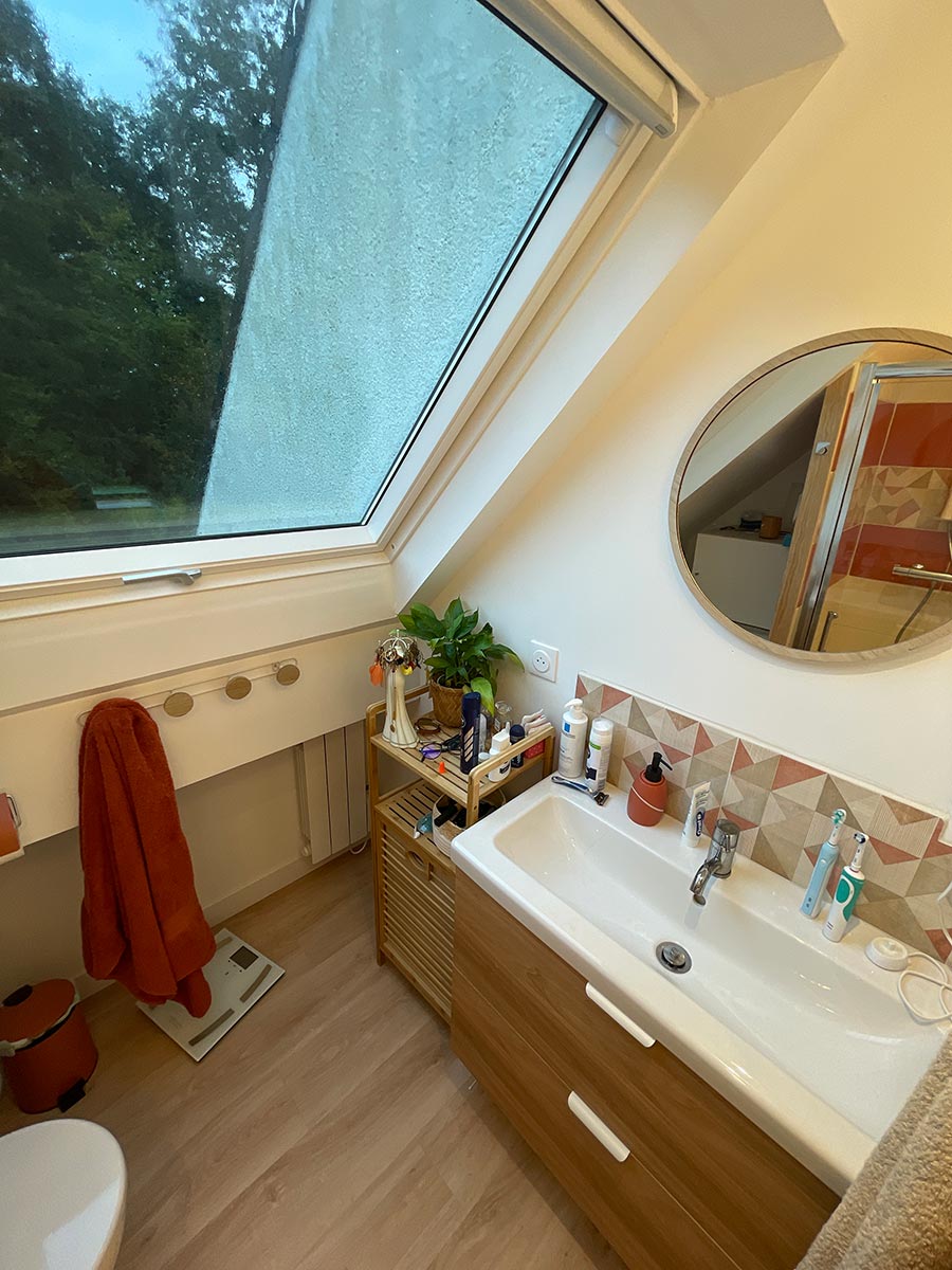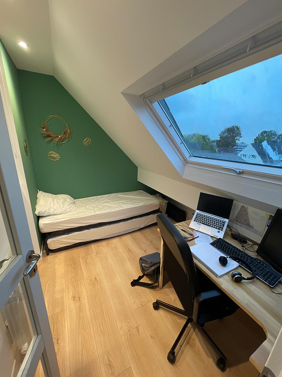 Pour améliorer l’éclairage naturel du comble, nous avons installé un Velux de 114×118, inondant les nouvelles pièces de lumière naturelle et créant ainsi une atmosphère chaleureuse et accueillante.