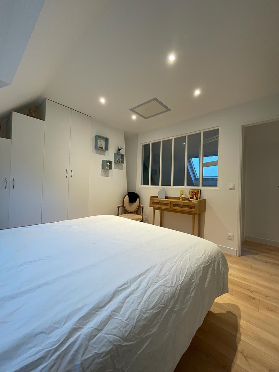 Cette transformation est signée RHP Combles Grand Ouest. Cet aménagement de combles perdus a été réalisé à Saint-Herblain (44800), en Loire-Atlantique, au cœur de la région du Pays de la Loire. Ce projet a été réalisé grâce à notre procédé Integra, utilisé sur une charpente à fermettes W Bois avec une pente de 35°.